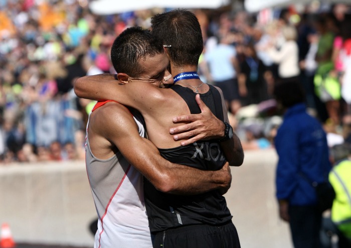 Πριν προλάβουν να κοπάσουν τα χειροκροτήματα για τον παιδικό αγώνα, έφτασε η ώρα των μεγάλων νικητών. Μερούσης, Θεοδωρικάκος και Ευαγγελίδης δικαιολογημένα αποθεώθηκαν. Ο μεγάλος νικητής από τη Χίο, ο Μερούσης, απολάμβανε την επικράτηση του, αλλά όταν τερμάτισε ο Θεοδωρικάκος, πήγε κοντά του και αγκαλιάστηκαν, ανταλλάσοντας κάποια λόγια που μόνο οι ίδιοι γνωρίζουν. Αντίπαλοι για 42 και κάτι χιλιόμετρα, αλλά φίλοι για πάντα! Ιδιο σκηνικό και όταν τερμάτισε ο τρίτος της παρέας, ο 40χρονος Καβαλιώτης Ευαγγελίδης…