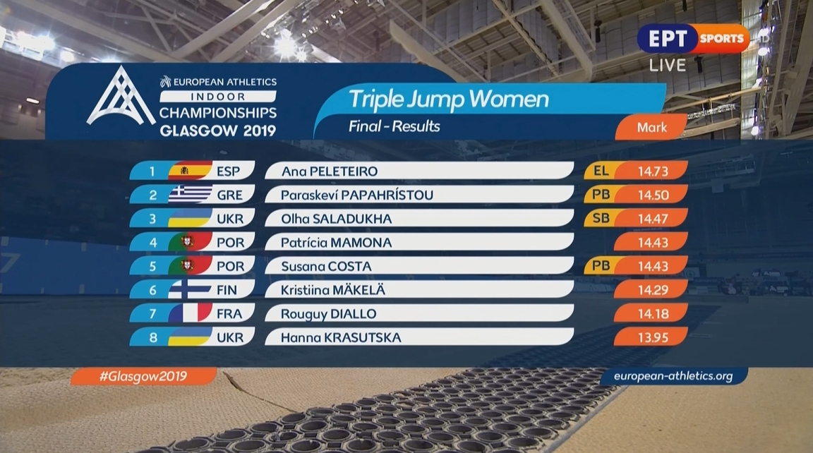 Ομως αποδείχθηκε δεν ήταν ικανό για να της χαρίσει και το χρυσό μετάλλιο. Κι αυτό γιατί η Ανα Πελετέιρο βρέθηκε σε εξαιρετική μέρα. Η Πελετέιρο είχε άλμα στα 14.56μ. και στη συνέχεια «πέταξε» και στα 14.73, επίδοση που είναι η καλύτερη στην Ευρώπη για φέτος!