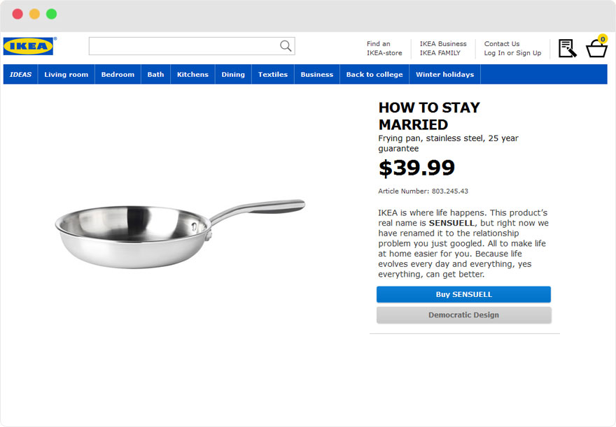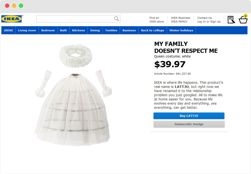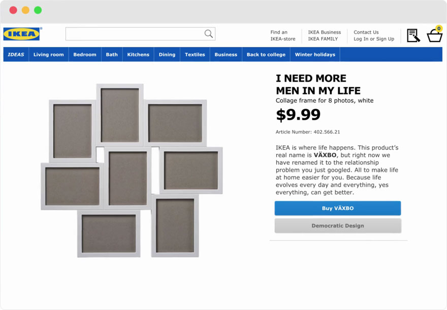 Μία ακόμη ευφάνταστη διαφημιστική καμπάνια κάνει η ΙΚΕΑ, η οποία μετονομάζει τα προϊόντα της με βάση τις πιο γκουγκλαρισμένες φράσεις για πρόβληματα ανθρωπίνων σχέσεων στη Σουηδία. Έχει δώσει σε μια σειρά από προϊόντα της το όνομα ενός προβλήματος έτσι ώστε ο καταναλωτής να μπορεί να βρει τη λύση που θέλει!