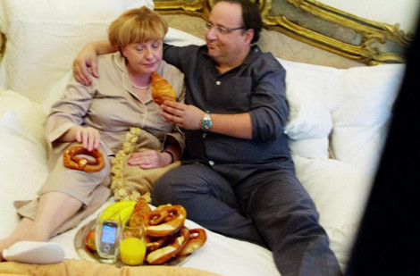 Συγκεκριμένα, οι σωσίες των δύο ηγετών πόζαραν ξαπλωμένοι στο κρεβάτι να δοκιμάζουν κλασσικές λιχουδιές των δύο χωρών, δηλαδή κρουασάν και πρέτζελ, αλλά και στο... πάτωμα, με τη γυναίκα που μοιάζει με την Ανγκελα Μέρκελ, τυλιγμένη με μια γούνα να έχει πέσει στα πόδια του άνδρα που μοιάζει με τον Γάλλο πρόεδρο.