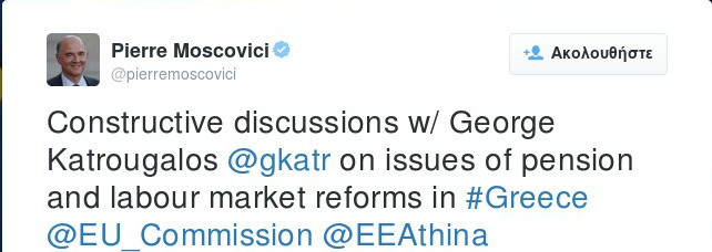 Οπως έγραψε είχε «εποικοδομητικές συνομιλίες» με τον υπουργό Εργασίας, Κοινωνικής Ασφάλισης και Κοινωνικής Αλληλεγγύης πάνω σε ζητήματα που άπτονται της μεταρρύθμισης του «συνταξιοδοτικού» και της «αγοράς εργασίας». Ο Γ. Κατρούγκαλος βρίσκεται στις Βρυξέλλες για το Συμβούλιο Απασχόλησης της ΕΕ.