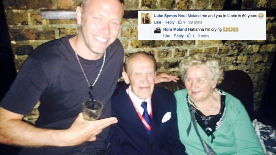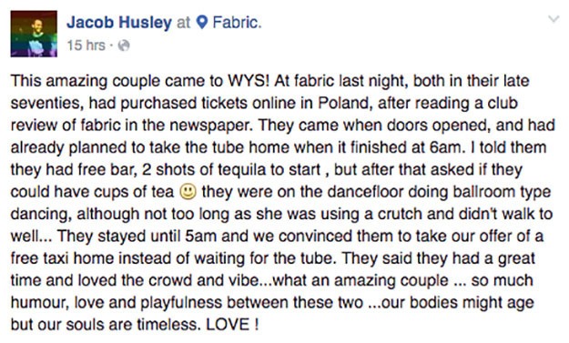 «Αυτό το καταπληκτικό ζευγάρι ήταν στο "WetYourSelf! Kι οι δύο έχουν περάσει τα 70 τους χρόνια κι είχαν κλείσει online τα εισιτήριά τους από την Πολωνία, αφού διάβασαν για το κλαμπ στην εφημερίδα! Ήρθαν όταν άνοιξαν οι πόρτες κι ήδη είχαν σχεδιάσει να επιστρέψουν με τα Μέσα μεταφοράς στις 6 το πρωί. Τους είπα ότι έχουν δωρεάν δύο σφηνάκια τεκίλα για αρχή, αλλά εκείνοι ήθελαν απλά δύο φλυτζάνια τσάι! Ήταν στην πίστα και χόρευαν ένα είδος χορού σαν βαλς, αλλά όχι για πολύ, αφού εκείνη περπατούσε με τη βοήθεια ενός μπαστουνιού και δεν περπατούσε καλά. Έμειναν μέχρι τις 5 το πρωί και φροντίσαμε να τους πείσουμε να πάρουν την προσφορά μας για δωρεάν ταξί, από το να περιμένουν ν' ανοίξει το μετρό. Είπαν ότι πέρασαν καλά και πως λάτρεψαν τον κόσμο και την ατμόσφαιρα. Τι απίστευτο ζευγάρι... με τόσο χιούμορ, αγάπη και παιχνίδια μεταξύ τους. Μπορεί να μεγαλώνουμε σωματικά, αλλά οι ψυχές μας είναι αιώνιες. Αγάπη!».