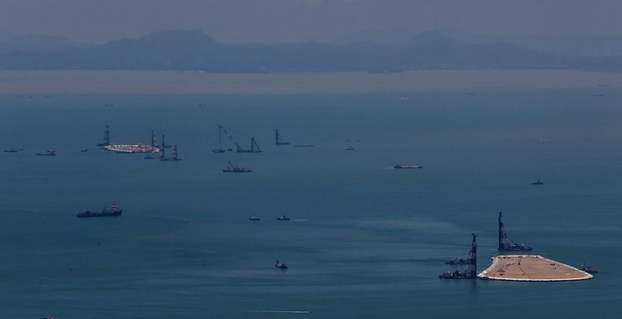 Αξιοσημείωτο, όμως, είναι το γεγονός ότι προκρίθηκε η κατασκευή τεσσάρων νησιών στη θάλασσα της Κίνας για να διευκολυνθεί το έργο των εκατοντάδων μηχανικών και τεχνικών που απαχολήθηκαν στην κατασκευή της, οι οποίοι συνέρευσαν από 14 χώρες για να εργαστούν στο φαραωνικό δημιούργημα.