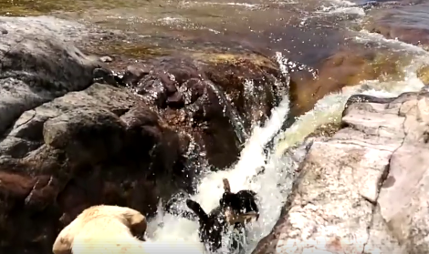 Όμως, τα ορμητικά νερά του ποταμού παρασέρνουν το άτυχο σκυλί, σε σημείο που να κινδυνεύει άμεσα η ζωή του, καθώς πέφτει σε ένα μικρό καταρράκτη, προσπαθώντας εναγωνίως να κρατήσει το κεφάλι του στην επιφάνεια.