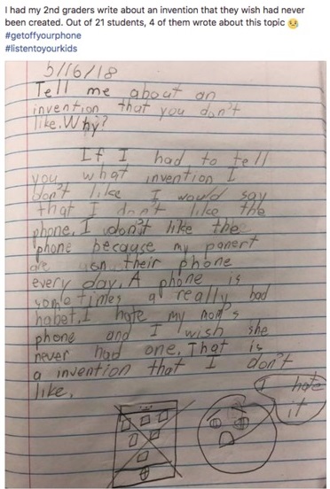 Μάλιστα, ο μικρός δεν έμεινε εκεί... Μετά το κείμενο, ζωγράφισε ένα smartphone με ένα μεγάλο Χ να το διαγράφει, ενώ δίπλα ακριβώς είχε ένα πρόσωπο που έλεγε: «Το μισώ».
