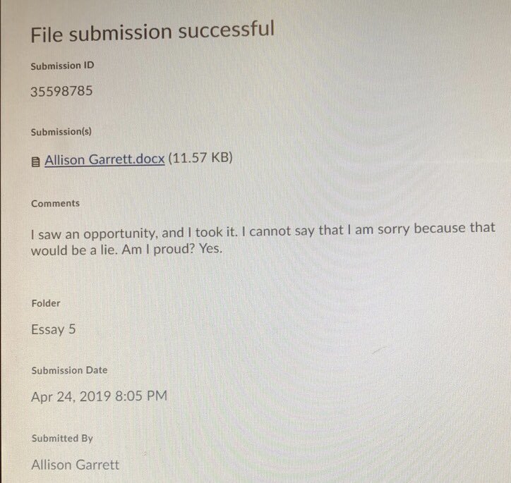 Για την ακρίβεια, ήταν 19, καθώς στο word που έστειλε υπήρχαν και άλλες 5: «That’s it. That’s the essay» (σ.σ Αυτή ήταν. Αυτή ήταν η έκθεση).