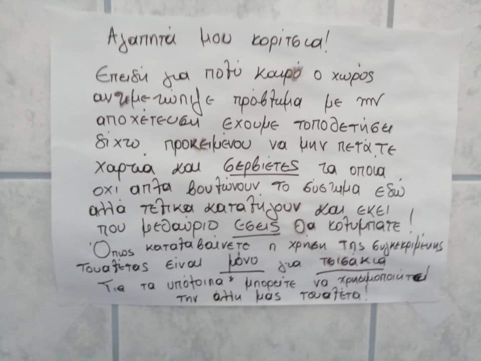 Μέχρι στιγμής, οι περισσότερες ανακοινώσεις που βλέπαμε στις ελληνικές τουαλέτες αφορούσαν τους άνδρες επισκέπτες...