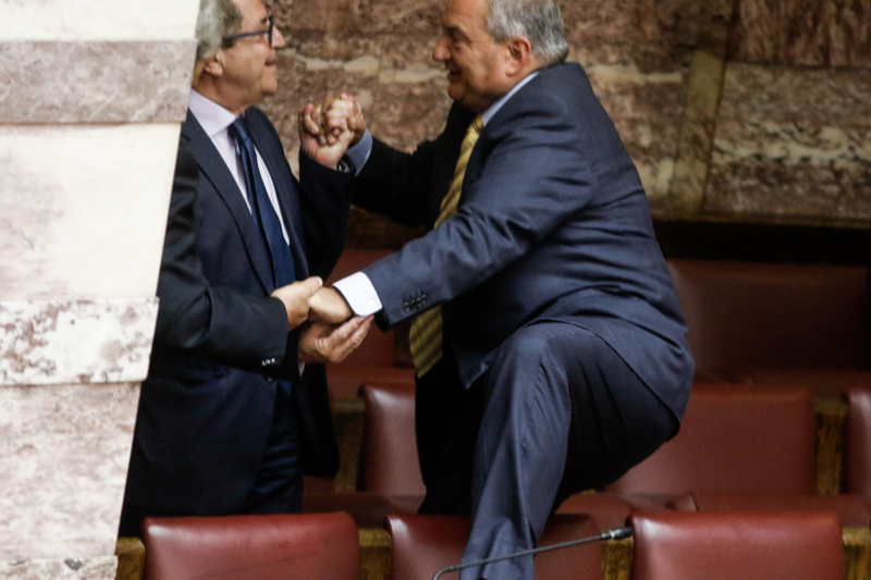 Κώστας Καραμανλής και Νίκος Νικολόπουλος κέντρισαν το ενδιαφέρον μετά το πέρας των ομιλιών στο Κοινοβούλιο, ενώ τις εντυπώσεις έκλεψε ο πρώην πρωθυπουργός με τα «ακροβατικά» του.