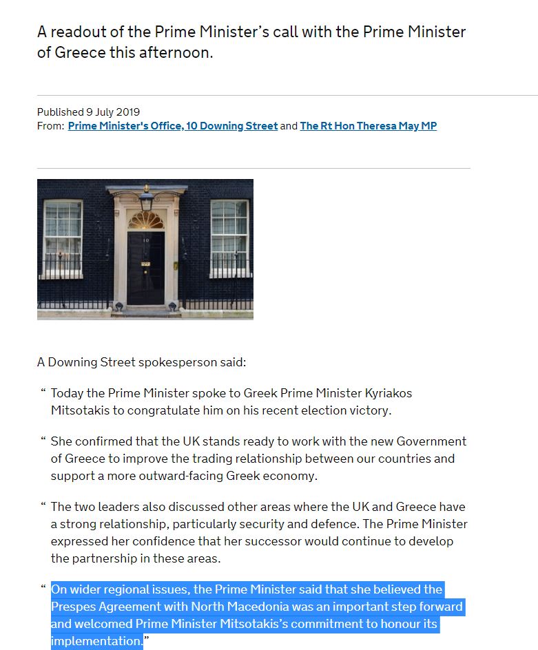 «Σε ευρύτερα εθνικά ζητήματα, η Πρωθυπουργός είπε οτι πιστεύει πως η Συμφωνία των Πρεσπών με την Βόρεια Μακεδονία ήταν ένα μπροστά και χαιρέτησε την δέσμευση του Πρωθυπουργού Μητσοτάκη να τηρήσει την εφαρμογή της».