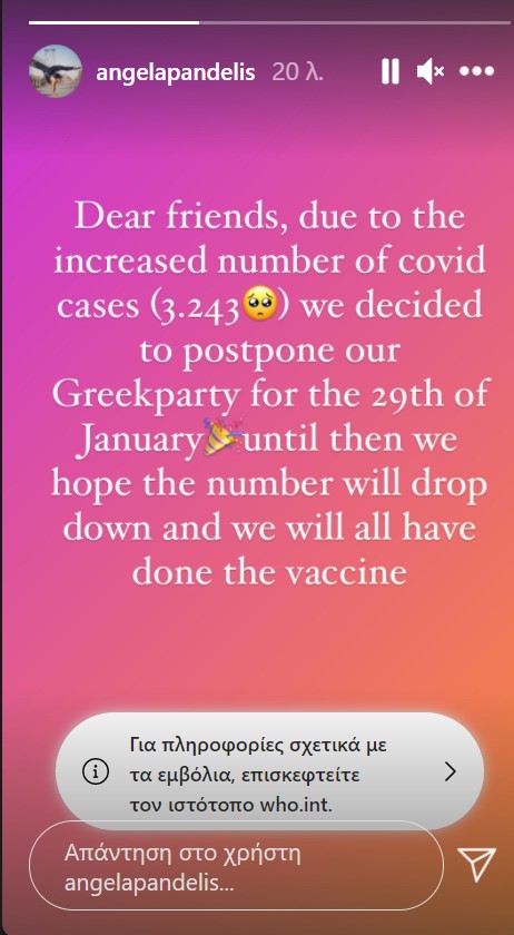 Το ποστάρισμα με το οποίο η Άντζελα Παντέλη ανακοίνωνε την μετάθεση, ανέφερε: «Αγαπητοί φίλοι, λόγω των αυξημένων κρουσμάτων κορονοϊού (3.243) αποφασίσαμε να αναβάλουμε το ελληνικό μας πάρτι για τις 29 Ιανουαρίου. Μέχρι τότε ελπίζουμε ο αριθμός να πέσει και να έχουμε κάνει όλοι το εμβόλιο»