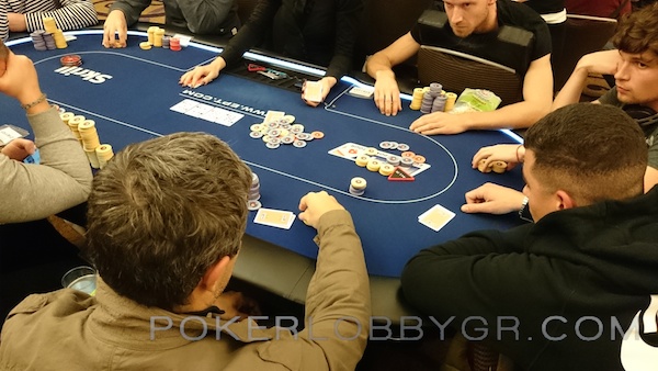 Στο showdown ο Βαγγέλης άνοιξε J-J και ο big blind K-10 πετυχαίνοντας ένα ρήγα στο board για να πάρει το pot.