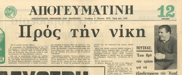 «Όλοι οι Έλληνες θα περιμένουν σήμερα το βράδυ με πολλές ελπίδες και αγωνία την έκβαση της μεγαλυτέρας αναμετρήσεως στην ιστορία του Ελληνικού ποδοσφαίρου μεταξύ του Παναθηναϊκού και του Άγιαξ. Κι αν οι παίκτες του πρωταθλητού φέρουν στην Αθήνα το πανάκριβο έπαθλο, το Κύπελλο Ευρώπης, ασφαλώς οι πανηγυρισμοί θα ξεπεράσουν σε ένταση κάθε προηγούμενο. Ο κ. Φέρεντς Πούσκας έχει προετοιμάσει μεθοδικά επί 12 ημέρες στο Λονδίνο τους ποδοσφαιριστάς του Παναθηναϊκού και όλες οι ενδείξεις πείθουν ότι η σημερινή μάχη θα διεξαχθεί μεταξύ ίσων αντιπάλων», έγραφε το Βήμα τη μέρα του αγώνα και ενημέρωνε: «Το ξενοδοχείο Ρόϋαλ Γκάρντεν πολιορκείται από χιλιάδες φανατικούς φιλάθλους του Παναθηναϊκού, που όλοι προσπαθούν να μεταδώσουν κάτι από τη δική τους ψυχική δύναμη στους Έλληνες ποδοσφαιριστάς».