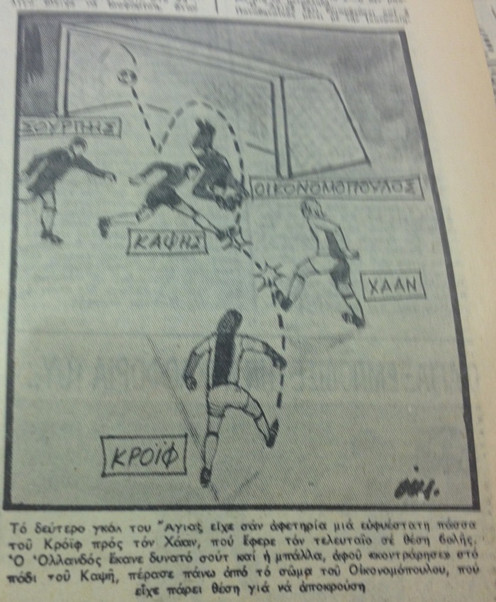 Το Βήμα τόνιζε: «Υπάρχει μια γαλλική παροιμία που λέει ότι "ήταν πολύ ωραίο για να είναι αληθινό". Ταιριάζει στο χθεσινό 2-0 του τελικού αγώνος του Κυπέλλου Πρωταθλητριών ομάδων Ευρώπης που διεξήχθη χθες το απόγευμα στο Ουέμπλεϋ. Ο Παναθηναϊκός, έπειτα από μια σειρά θριαμβευτικών επιτυχιών στη διοργάνωση αυτή, έφθασε να διεκδικήσει το ευρωπαϊκό στέμμα. Πήγε με πολλές ελπίδες στο Λονδίνο, όπου θα είχε για αντίπαλο τον Άγιαξ Ολλανδίας. Δεν ήταν φαβορί. Μόνον ένα θαύμα ποδοσφαιρικό θα μπορούσε να του δώση τον μεγάλο αυτόν τίτλο. Το θαύμα όμως δεν έγινε και οι Ολλανδόι κέρδισαν τον αγώνα 2-0, κατακτώντας έτσι τον τίτλο, αυτόν που πέρυσι είχε κατακτήσει η Σέλτικ Σκωτίας. 93.000 θεαταί στο Ουέμπλεϊ και πάνω από 100.000.000 τηλεθεαταί παρακολούθησαν στην Αυστραλία, στη Νέα Ζηλανδία, στην Ευρώπη και στην Αμερική τον αγώνα αυτό, που κράτησε σε αγωνία όλη σχεδόν την Ελλάδα χθες το βράδυ»...