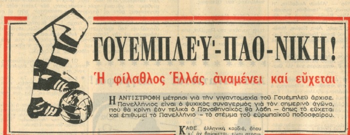 Η βραδυνή τόνιζε: «Κάθε ελληνική καρδιά, όπου κι αν βρίσκεται, είναι στραμμένη προς το τεράστιο γήπεδο της αγγλικής πρωτυεούσης, όπου οι σκέψεις και οι ευχές των φιλάθλων συμπαρίστανται νοερά στους ένδεκα άσσους του ΠΑΟ. Τόση είναι η συγκίνησι και η αγωνία για τη σημερινή συνάντησι και τόσο μεγάλο το ενδιαφέρον για την παρακολούθησι από ραδιοφώνου και τηλεοράσεως που θα μεταδοθή απευθείας, ώστε ανεβλήθησαν οι παραστάσεις όλων των θεάτρων, ανεβλήθησαν... δίκες και ματαιώθηκαν κάθε είδους συναντήσεις, συγκεντρώσεις και μετακινήσεις».