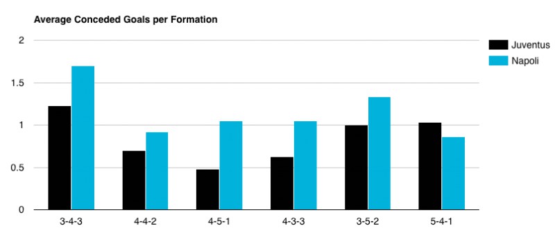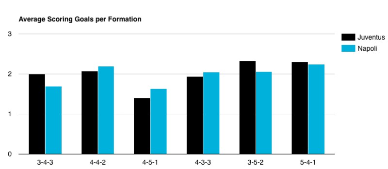 Οπως φαίνεται, η Νάπολι έχει σκοράρει περισσότερα γκολ κατά μέσο όρο, όταν παίζει με ομάδες που αγωνίζονται με 4-4-2, 4-5-1 και 4-3-3. Από την πλευρά της, η Γιουβέντους σημείωσε αρκετά περισσότερα τέρματα εναντίον του 3-4-3 και κατά δεύτερο λόγο απέναντι στο 5-4-1.