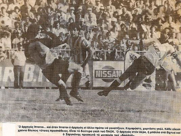 Η Τούμπα «βράζει» όχι κατά του Ολυμπιακού, αλλά κατά της διοίκησης του ΠΑΟΚ, καθώς λίγες μέρες πριν από το ντέρμπι είχε παραιτηθεί ο Λες Σάννον, διαφωνώντας από τις κινήσεις του τότε γενικού γραμματέα, Βασίλη Σεργιαννίδη. Ο Αγγλος προπονητής με τεράστια επιρροή και αγάπη στις τάξεις των οπαδών κάθεται τελικά στον πάγκο και βλέπει στο 61ο λεπτό τον Σταύρο Σαράφη να «απογειώνεται» και να καρφώνει την μπάλα στο «γάμα» της εστίας του ανήμπορου να αντιδράσει Παναγιώτη Κελεσίδη, αφού πρώτα πήρε παραμάζωμα τον Θανάση Αγγελή. Είναι από τις φωτογραφίες που λατρεύει να βλέπει ο πρώτος σκόρερ στην ιστορία του «Δικεφάλου».