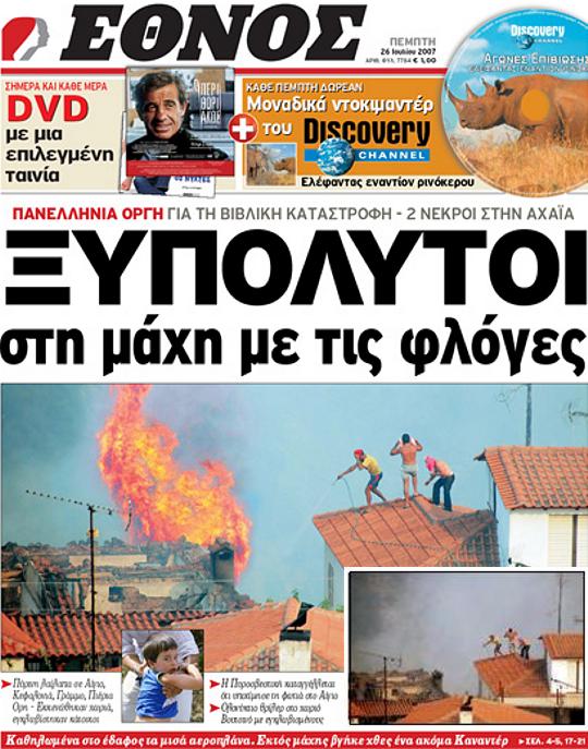 Τον Ιούλιο του 2007 η εφημερίδα «Έθνος» δημοσίευσε στο πρωτοσέλιδο θέμα τις μεγάλες πυρκαγιές της Αχαΐας, όπου εμφανίζονται τεράστιες φλόγες να ξεπηδούν προς τον ουρανό κι απελπισμένους ανθρώπους να προσπαθούν να τις σβήσουν. Ωστόσο, για κακή τύχη όποιου το επέλεξε, ακριβώς ίδια φωτογραφία είχε ήδη κυκλοφορήσει διαδικτυακά αλλά σ' αυτήν δεν εμφανίζονταν οι φλόγες. Λεπτομέρεια θα πείτε ή, το δημοσιογραφικό μότο "πολλοί θα το δουν λίγοι θα το καταλάβουν". Ωστόσο το "Εθνος"... εκτέθηκε.