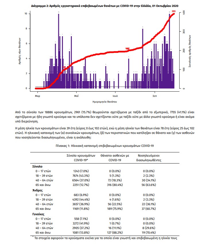Τέλος, έχουμε 2 ακόμα καταγεγραμμένους θανάτους και 393 θανάτους συνολικά στη χώρα. 144 (36.6%) γυναίκες και οι υπόλοιποι άνδρες. Η διάμεση ηλικία των θανόντων συμπολιτών μας ήταν τα 78 έτη και το 96.7% είχε κάποιο υποκείμενο νόσημα ή/και ηλικία 70 ετών και άνω».