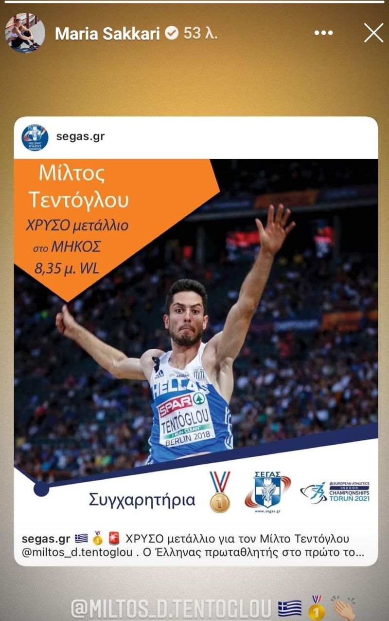 Με stories στα social media η Μαρία Σάκκαρη συνεχάρη τον Μίλτο Τεντόγλου για την κατάκτηση του χρυσού μετάλλιου στο μήκος στο Ευρωπαϊκό πρωτάθλημα κλειστού στίβου του Τόρουν.