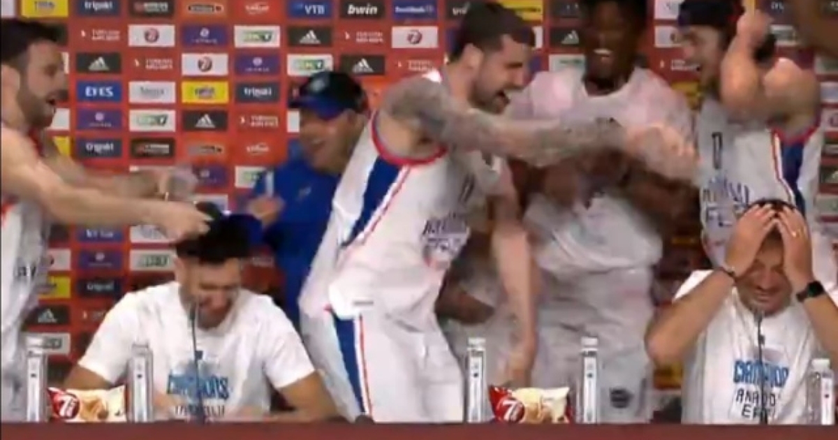 Την ώρα που οι Εργκίν Αταμάν και Βασίλιε Μίτσιτς έδιναν την καθιερωμένη συνέντευξη Τύπου μετά τον τελικό, οι υπόλοιποι παίκτες της Εφές έκαναν «ντου» στην αίθουσα και μπουγέλωσαν τον προπονητή τους όπως επίσης και στον MVP της EuroLeague.