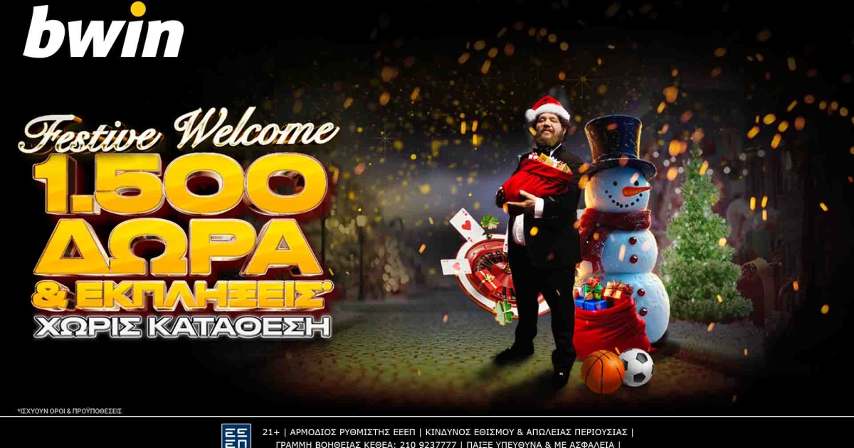 Η bwin σε υποδέχεται με την Festive Welcome προσφορά* χωρίς κατάθεση, που μοιράζει 1.500 δώρα* τα φετινά Χριστούγεννα και ένα εορταστικό Magic Box με 300.000 εκπλήξεις, έτοιμες να γίνουν όλες δικές σου! Είσαι μέσα στο παιχνίδι σε Στοίχημα και Live Casino με τις πιο εορταστικές προσφορές*.