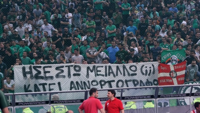 Το «ερυθρόλευκο» πανό έγραφε τη λέξη «συγχαρητήρια» «συνχαρητήρια» και οι «πράσινοι» φρόντισαν να απαντήσουν με το «ησε στω μειαλλώ κάτει αννορτώγραφο», με ένα νέο «συνχαρητήρια» κι άλλο ένα που περιέρχει αρκετά κοσμητικά επίθετα!