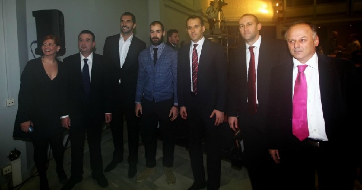 Τα αδέλφια Αγγελόπουλοι, ο κ. Γιώργος Σκινδήλιας κι όλοι οι παίκτες του Ολυμπιακού, που βρίσκονταν και πέρσι στην ομάδα, μαζί με τον Ντούσαν Ίβκοβιτς ανέβηκαν στο βάθρο για να παραλάβουν το βραβείο για την καλύτερη ομάδα της χρονιάς.