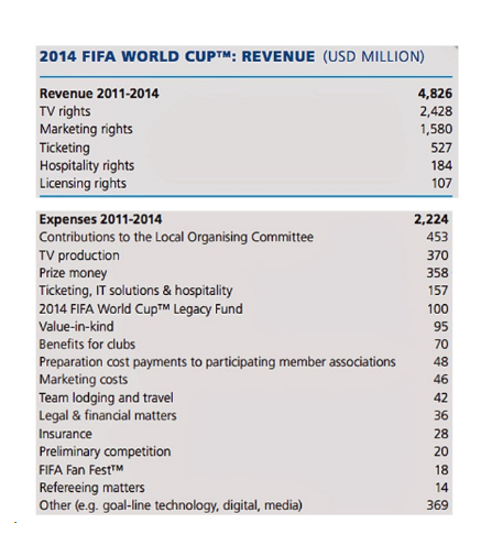 Το 2014, η FIFA σημείωσε κέρδη $4.800.000.000, ενώ τα έξοδά της συνολικά δεν ξεπέρασαν τα $2.700.000.000. Αυτό είχε σαν αποτέλεσμα το κέρδος της FIFA από το World Cup του 2014 να φτάσει τα $2.100.000.000.