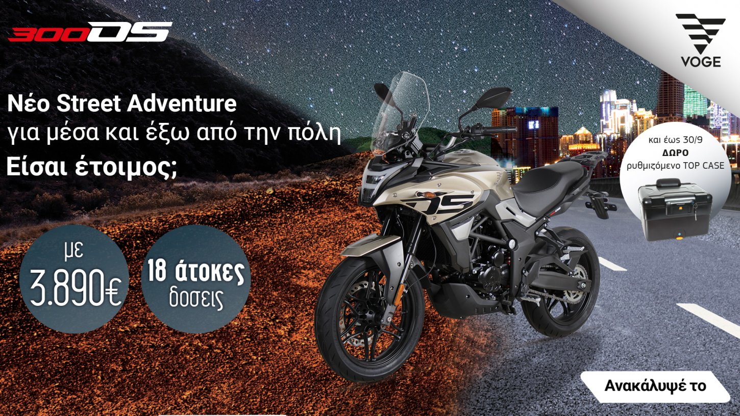 To Voge 300DS είναι η Premium μοτοσυκλέτα που όλοι περιμέναμε. Πρόκειται για μια κορυφαία πρόταση στη δημοφιλή κατηγορία των μοντέλων Street Adventure Touring και ο διττός του χαρακτήρας θα σας χαρίσει όλα όσα επιθυμείτε από μία μοτοσυκλέτα για διαδρομές μέσα και έξω από την πόλη. Διαθέτει μονοκύλινδρο υγρόψυκτο κινητήρα 300cc που αποδίδει 29Hp και 25Nm ροπής, δικάναλο ABS της Bosch και φρένα με δισκόφρενα μαργαρίτα. Η ανάρτηση απαρτίζεται από ανεστραμμένο πιρούνι 35mm και μονό αμορτισέρ με μοχλικό σύστημα, τα φώτα είναι Full LED, η LCD οθόνη του πίνακα οργάνων παρέχει πλήρεις ενδείξεις και ο ανεμοθώρακας ρυθμίζεται σε ύψος.