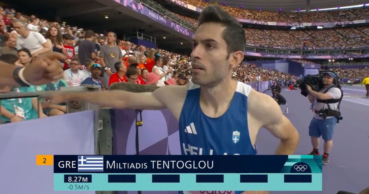 Η πρώτη προσπάθεια του Μίλτου Τεντόγλου ήταν στα 8.27μ. στον τελικό του άλματος εις μήκους στους Ολυμπιακούς Αγώνες του Παρισιού.