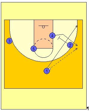 Ο Ζήσης (1) δίνει την μπάλα στον Στόουνρουκ (4) που βγαίνει στα πλάγια με τη βοήθεια του σκριν του Καουκένας (2). Αμέσως μετά ο Ζήσης κόβει στη γωνία της δυνατής πλευράς. (σχήμα 4)