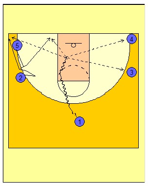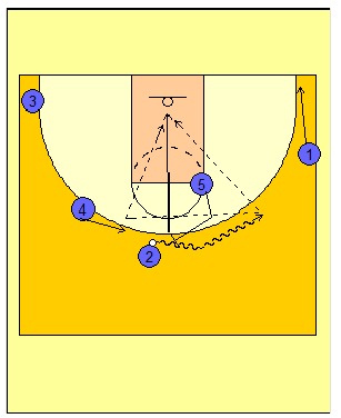 Μια δεύτερη επίθεση που χρησιμοποιούν οι Πράσινοι είναι με τον Καλάθη (1) να κάνει πάσα στον Φώτση (4) και αμέσως μετά να κάνει διπλό σκριν μαζί με τον Μπατίστ (5) για τον Διαμαντίδη (2) που ανεβαίνει στην κορυφή (σχήμα 2)