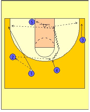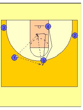 Τέλος, μια απλή ιδέα για να πιάσει ο Σοφοκλής την μπάλα στο κέντρο της ρακέτας είναι το σκριν του Έλληνα σέντερ στον Μπλούθενταλ (4), ο οποίος βγαίνει από το σκριν για να σουτάρει ή να τροφοδοτήσει τον Σχορτσιανίτη (σχήμα 7).