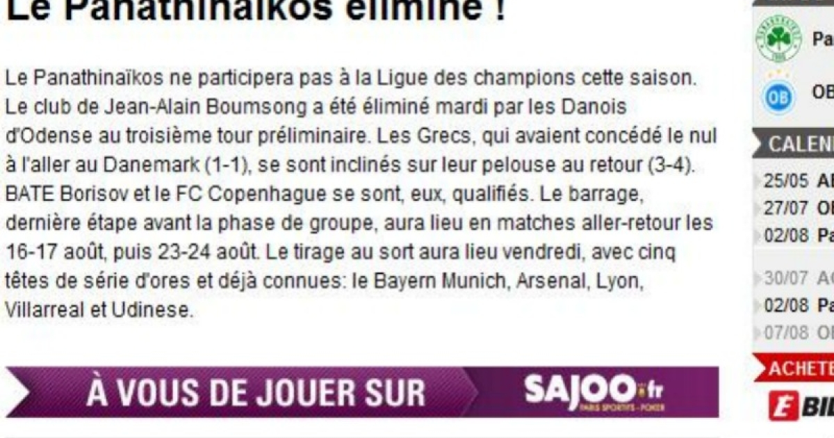 Με τον τίτλο: Ο Παναθηναϊκός αποκλείστηκε, η γαλλική ιστοσελίδα «Equipe» εκφράζει την έκπληξή της για τον οδυνηρό αποκλεισμό των Πράσινων. Δεν ξέχασαν τον συμπατριώτη τους Ζαν Αλέν Μπουμσόνγκ, αναφέροντας πως το κλαμπ του Γάλλου αμυντικού αποκλείστηκε στον τρίτο προκριματικό γύρο από την Δανέζικη Οντένσε.