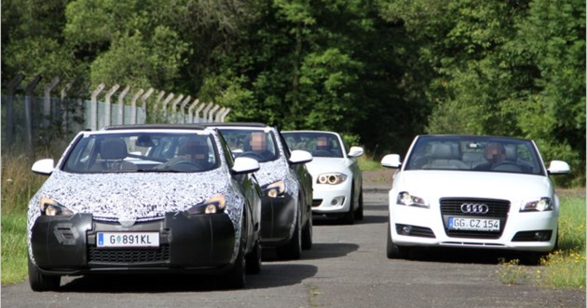 Αυτό ισχύει βεβαίως και για τη μελλοντική ανοιχτή έκδοση του Opel Astra, για το οποίο η ζυγαριά έγειρε υπέρ της δεύτερης λύσης, δηλαδή της κουκούλας. Φαίνεται μάλιστα ότι οι άνθρωποι της Opel εμπνεύσθηκαν αρκετά στοιχεία του νέου μοντέλου τους από τους κύριους ανταγωνιστές του. Δεν είναι λοιπόν τυχαίο, ότι ο κατασκοπευτικός φακός συνέλαβε δύο καμουφλαρισμένα πρωτότυπα του νέου Astra Cabrio παρέα με ένα ανοιχτό Audi A3 Cabrio και μία BMW σειρά 1 Cabriolet.