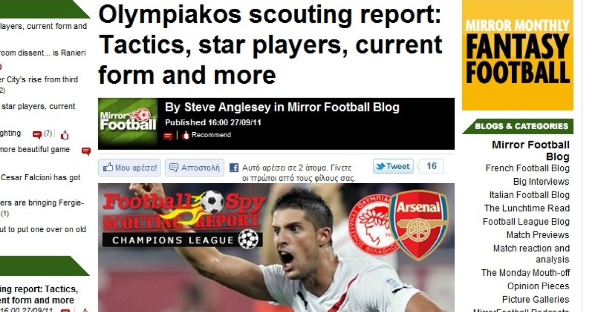 Το site «mirrorfootball.co.uk» πέρασε από... σκάνερ τον Ολυμπιακό και παρουσίασε τα πλεονεκτήματα και τα μειονεκτήματά του. Μεταξύ άλλων στο κείμενο αναφέρεται πως «ο Έλληνας γίγαντας Ολυμπιακός ελπίζει σε θετικό αποτέλεσμα στον αγώνα της Τετάρτης απέναντι στην Άρσεναλ στο Έμιρεϊτς». Επιπλέον γίνεται ειδική μνεία στις προηγούμενες συναντήσεις των δύο ομάδων, το 2009, όταν ο Ολυμπιακός είχε νικήσει με 1-0 στο Φάληρο και είχε χάσει με 2-0 στην Αγγλία.