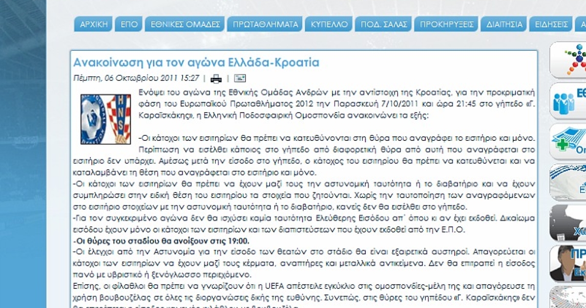 Ενόψει του αγώνα της Εθνικής Ομάδας Ανδρών με την αντίστοιχη της Κροατίας, για την προκριματική φάση του Ευρωπαϊκού Πρωταθλήματος 2012 την Παρασκευή 7/10/2011 και ώρα 21:45 στο γήπεδο «Γ. Καραϊσκάκης», η Ελληνική Ποδοσφαιρική Ομοσπονδία ανακοινώνει τα εξής: