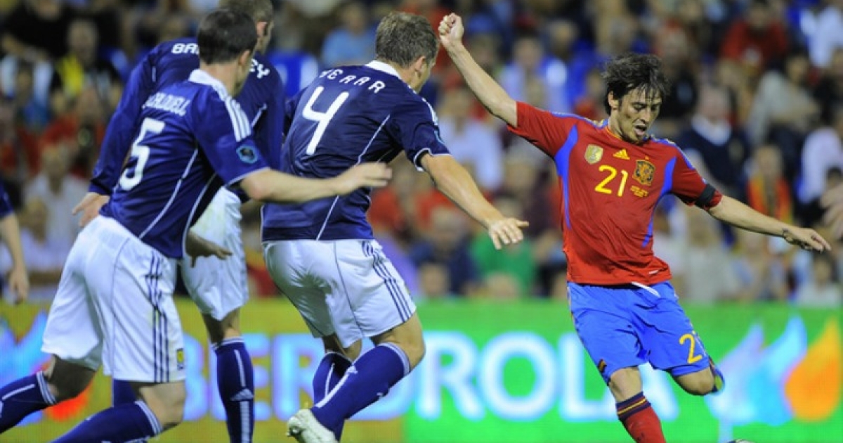 Η Ισπανία χάρις σε δύο γκολ του Σίλβα και ένα του Βίγια νίκησαν με 3-1 την Σκωτία στην τελευταία αγωνιστική του 9ου προκριματικού ομίλου. Μοιραία κατέλαβε την πρώτη θέση στο γκρουπ της.