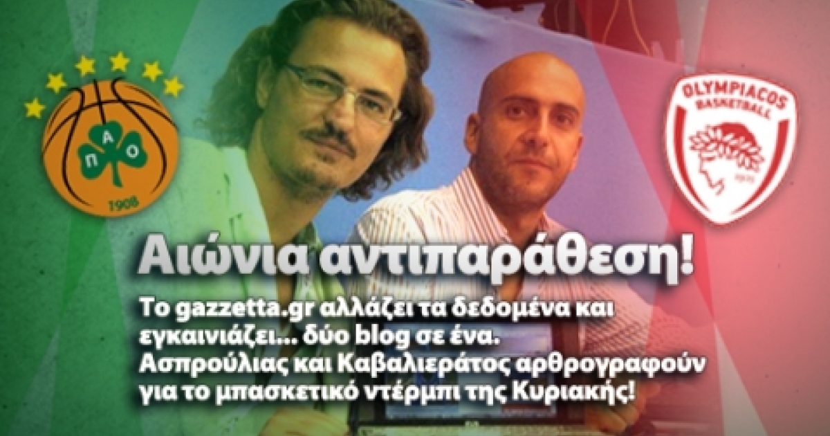 Πριν από τριάμισι χρόνια, το gazzetta.gr εγκαινίασε τα blogs των δημοσιογράφων και έδωσε την ευκαιρία σε όλους εσάς να επικοινωνήσετε μαζί τους, να συμφωνήσετε και να διαφωνήσετε. Σήμερα, η ανάγκη της εποχής προχωρά τη διαδραστική επικοινωνία μέσω των αρθρογράφων ένα βήμα παρακάτω. Το μπάσκετ έχει εξελιχθεί σε υπόθεση των δύο «αιωνίων», με τον πρωταθλητή Παναθηναϊκό και τον ανταγωνιστή Ολυμπιακό να μονομαχούν σχεδόν μονότονα. Πώς θα μπορούσε λοιπόν να συνεχίζει να απουσιάζει ένα blog σχεδόν εξ ολοκλήρου αφιερωμένο στους δύο μεγάλους του μπάσκετ που κλέβουν τα φώτα της δημοσιότητας; Και τι καλύτερο για να στείλουμε το δικό μας μήνυμα ενότητας παραμονές του ντέρμπι, από το να ενώσουμε τα δύο blogs σε ένα, φέρνοντας δύο καλούς φίλους και εξαιρετικούς δημοσιογράφους, τον Σπύρο Καβαλιεράτο από τη Sportday και τον Θανάση Ασπρούλια από το Goalnews σε κοινό blog! Κοινή άλλωστε είναι και η πορεία τους, όπως θα διαβάσετε στο σχετικό βιογραφικό...