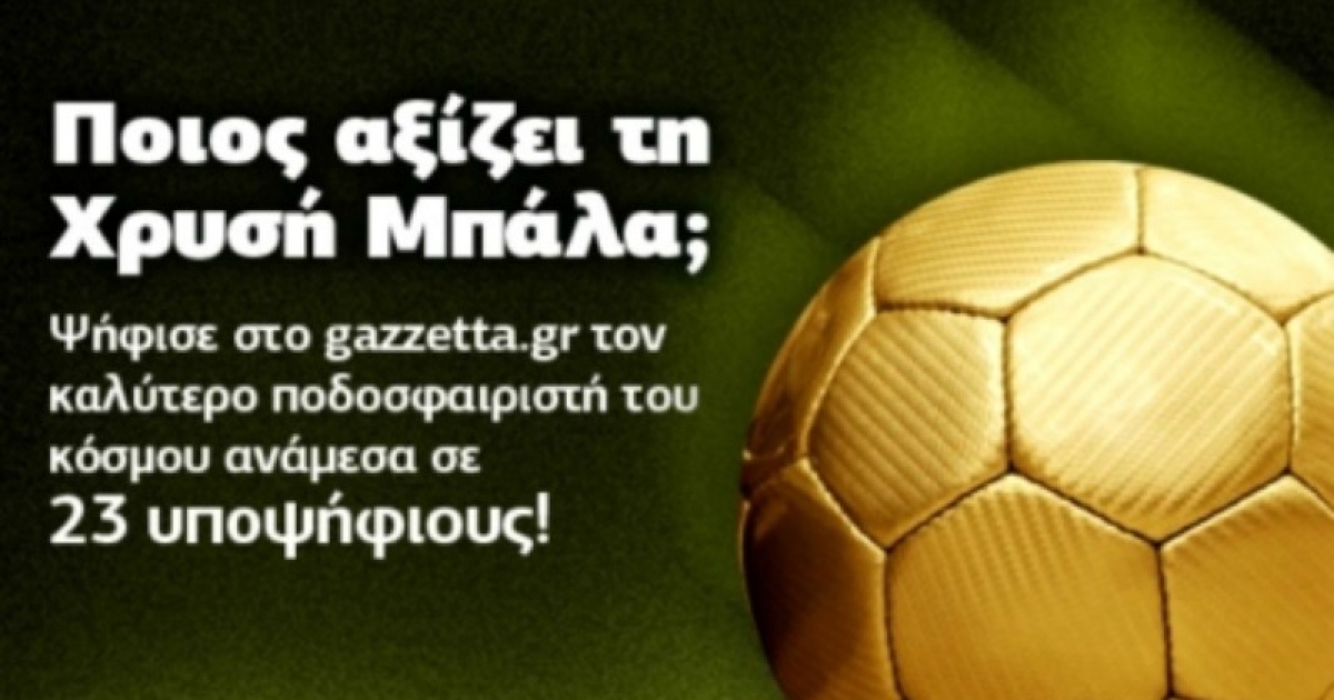 Το gazzetta.gr όμως σας προσφέρει τη δυνατότητα να κάνετε και εσείς τις δικές σας επιλογές αναφορικά με τον καλύτερο του κόσμου. Επιλέξτε τους τρεις παίκτες της προτίμησής σας (τρεις οι βραβεύσεις από FIFA) και λίγες ημέρες πριν την βράβευση θα σας δοθεί εκ νέου η δυνατότητα να διαλέξετε το Νο 1!