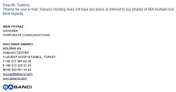 Thanks for your e-mail. Sabanci Holding does not have any plans or interest to buy shares of AEK football club.