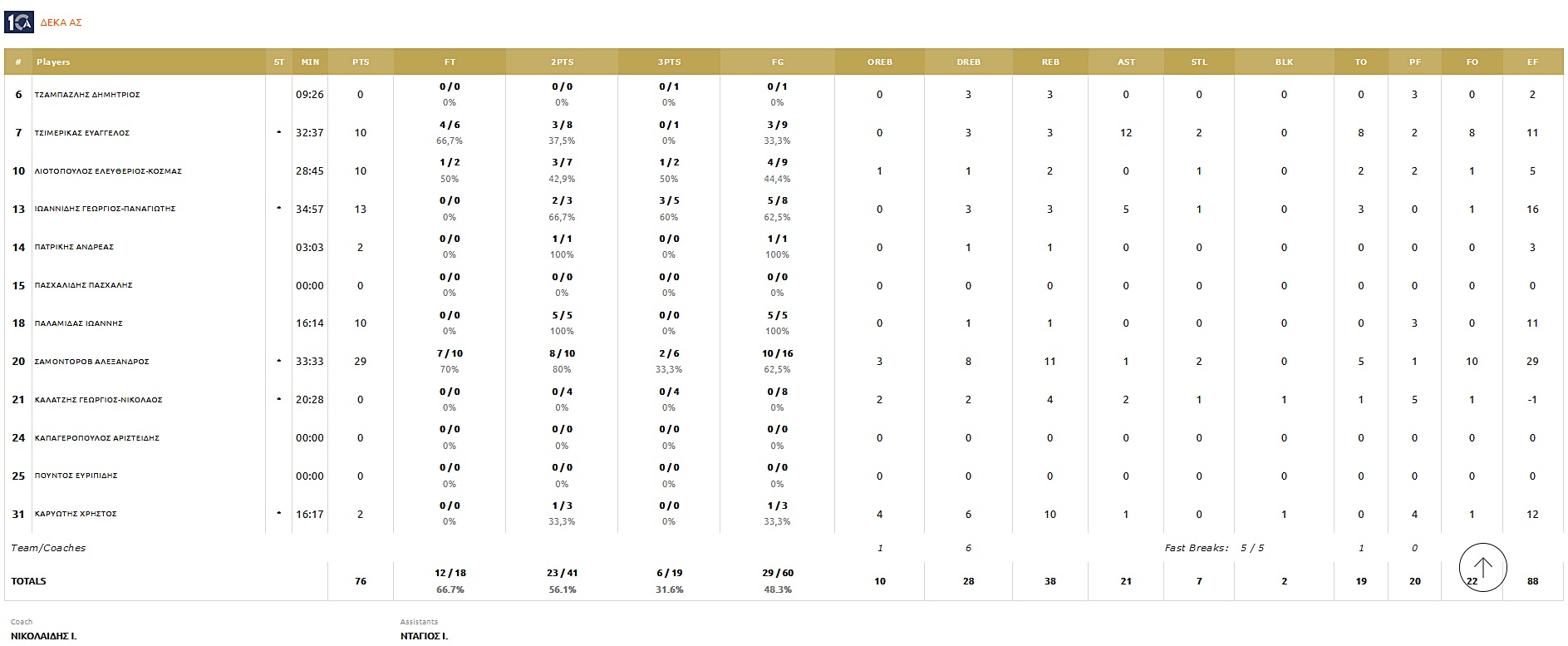 Ο Αλέξανδρος Σαμοντούροβ με 29 πόντους και 11 ριμπάουντ κατέγραψε double double για τους νικητές, όπως κι ο Βαγγέλης Τσιμερίκας που είχε 10 πόντους και 12 ασίστ.