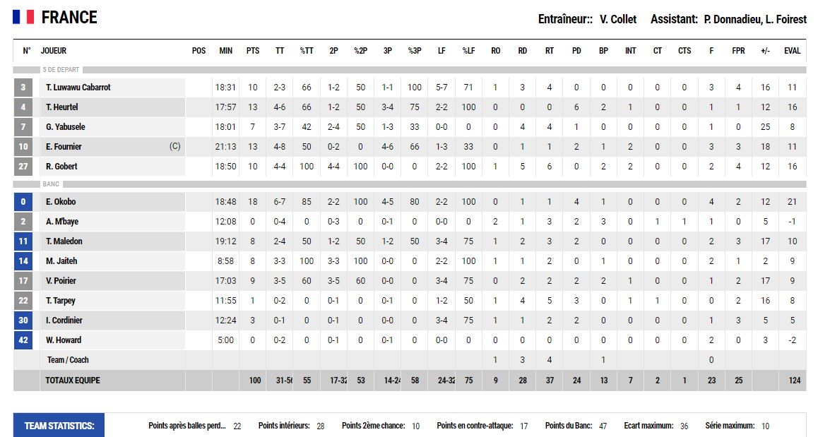 Κάτι που φαίνεται από τη νίκη και την τελική διαφορά των 32 πόντων! Ο Οκόμπο με 18 πόντους και 4/5 τρίποντα ήταν ο πρώτος σκόρερ για την Γαλλία, ενώ οι Ερτέλ και Φουρνιέ πρόσθεσαν από 13 πόντους ο καθένας. Η Γαλλία βρέθηκε σε εξαιρετική ημέρα έξω από τα 6.75 μέτρα, κάτι που αποτυπώθηκε από τα 14/24 τρίποντα!