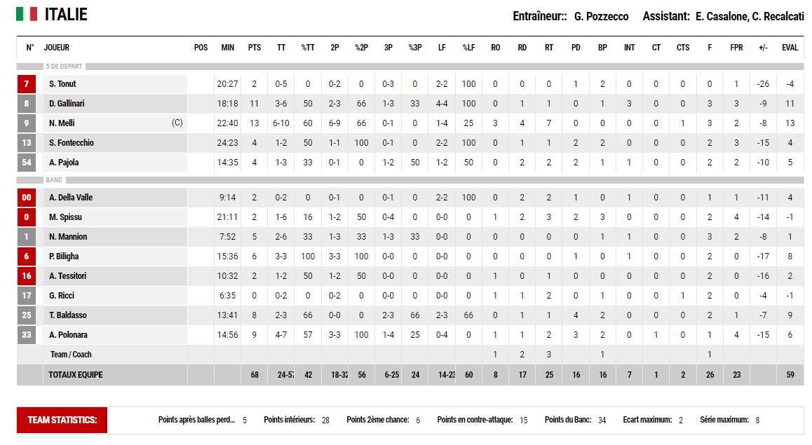 Για την Ιταλία την οποία θα αντιμετωπίσει η εθνική Ελλάδα στο Eurobasket, διασώθηκε ο Νικολό Μέλι ο οποίος είχε 13 πόντους και 7 ριμπάουντ, ενώ ο Γκαλινάρι αγωνίστηκε 18 λεπτά και μέτρησε 11 πόντους με 3/6 εντός παιδιάς.