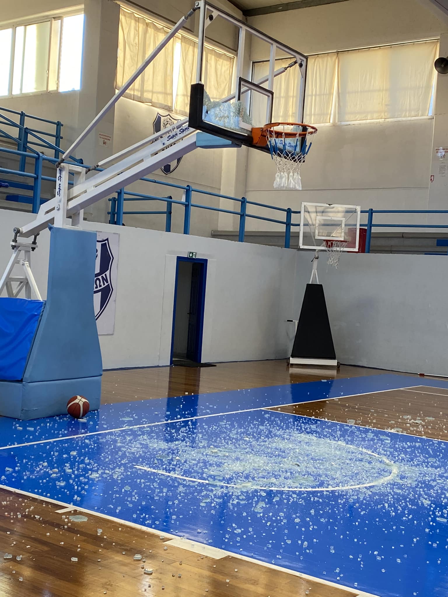 Κάτι ανάλογο συνέβη και πριν από το τζάμπολ του αγώνα Απόλλωνα Σμύρνης - Ίκαρος Νέας Σμύρνης καθώς την ώρα που γινόταν το ζέσταμα «διαλύθηκε» το ένα ταμπλό!