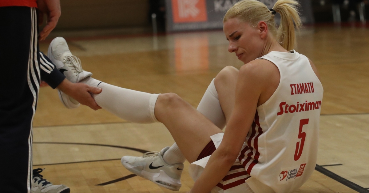 Η αρχηγός του Ολυμπιακού, Εβίνα Σταμάτη, προσγειώθηκε άτσαλα στο αριστερό της πόδι και αποχώρησε τραυματίας περίπου 3,5 λεπτά πριν το ημίχρονο στο ντέρμπι.