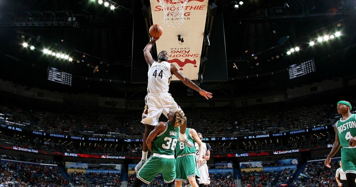 Θύμα του παίκτη των Πέλικανς ήταν ο Μάρκους Σμαρτ των Σέλτικς, αφού πέρασε από πάνω του κάρφωσε με δύναμη τη μπάλα!