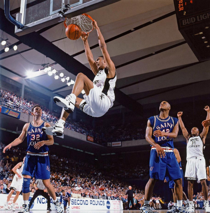- Ο πιτσιρικάς Τιμ Ντάνκαν καρφώνει εντυπωσιακά στο παιχνίδι του Wake Forest με το Saint Louis, στον β' γύρο του NCAA Tournament στις 18 Μαρτίου 1995, στη Βαλτιμόρη!