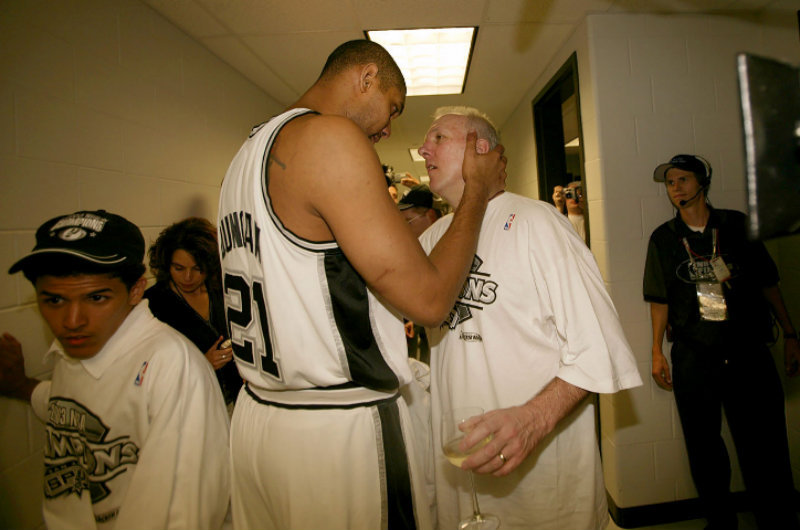 -Ο Ντάνκαν, ο Πόποβιτς κι ένα ποτήρι σαμπάνια για το πρωτάθλημα του 2003, κόντρα στους Νετς / 15 Ιουνίου, 2003