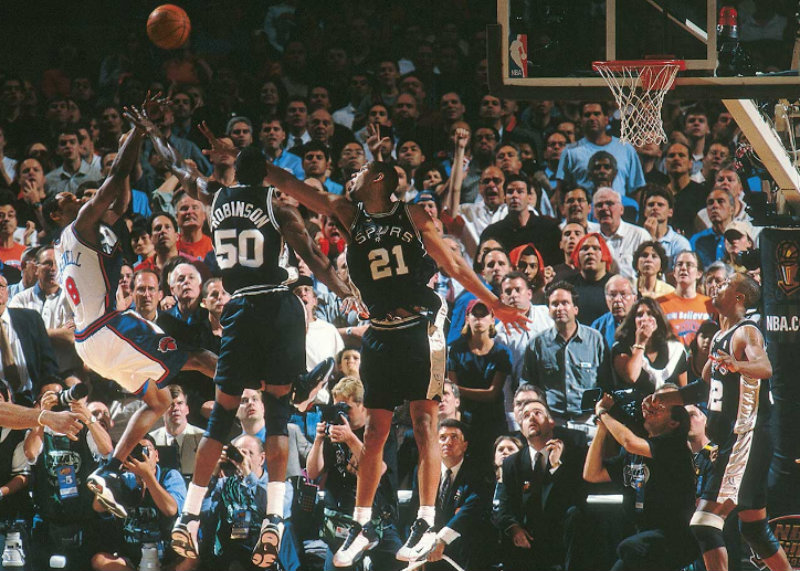 -Τιμ Ντάνκαν και Ντέιβιντ Ρόμπινσον μαρκάρουν τον Λατρέλ Σπρίουελ, ο οποίος αστοχεί στο τελευταίο σουτ του Game 5 των τελικών στη Νέα Υόρκη! / 25 Ιουνίου 1999